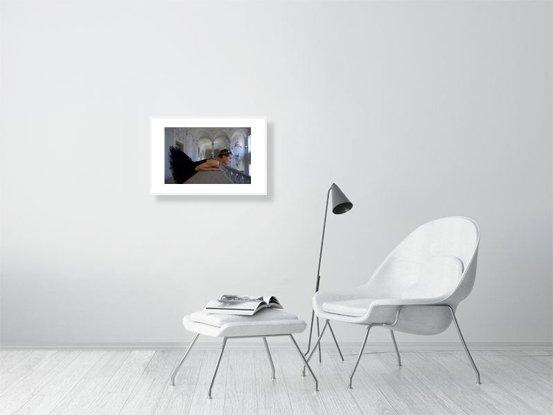 A captivating juxtaposition of ballet and classical architecture, this fine art print embodies the poise of a ballerina in a black tutu, elegantly leaning against the ornate Baroque-style balustrade of a grand palace. The intricate detailing of the surroundings enhances the timeless grace of the dancer. This exquisite composition meets museum-quality archival standards and is meticulously crafted for collectors and ballet aficionados.