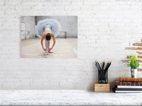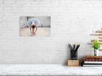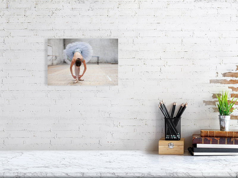 This refined fine art print encapsulates the delicate yet determined nature of a ballerina in a moment of quiet preparation. The dancer, elegantly bending to adjust her pointe shoes, is framed in a soft-toned, industrial setting, creating a juxtaposition of strength and grace. Meticulously crafted to meet the highest art market standards, this piece ensures museum-quality longevity and precision.